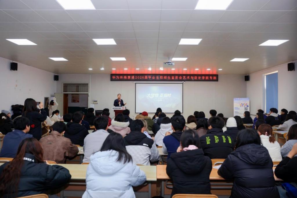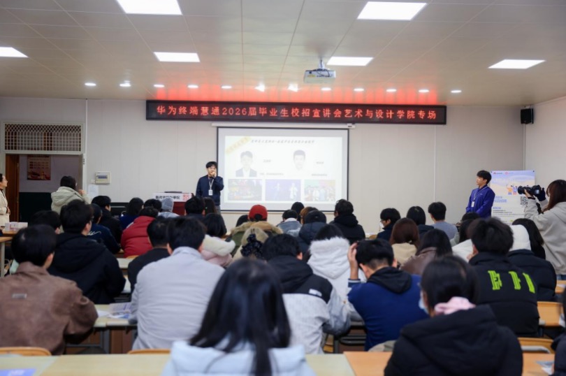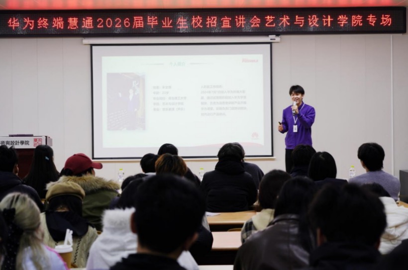 12月9日下午,华为终端深圳慧通商务有限公司2026届校招宣讲会艺术与设计学院专场,在市北校区二号教学楼416教室顺利开展。华为山东终端业务部HR总监吴欣佩、华为慧通(青岛区)HR经理丁玲及华为慧通相关团队成员一行,来校与学院毕业生共赴职业之约。宣讲会由学院就业辅导员张薇薇主持,学院党委副书记、副院长张恬,学校就业指导中心副主任刘欣然,学院研究生辅导员赵子萍及2026届毕业生参与本次宣讲会。