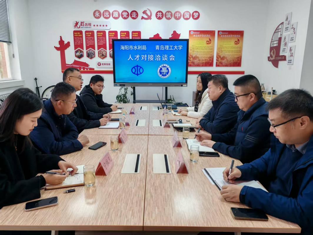 近日,海阳市水利局党组成员、河长制管理服务中心主任张磊一行到青岛理工大学艺术与设计学院进行考察调研。艺术与设计学院党委书记孙波,院长朱宏轩,党委副书记张恬、副院长丁南参与会面,进行人才对接洽谈会。