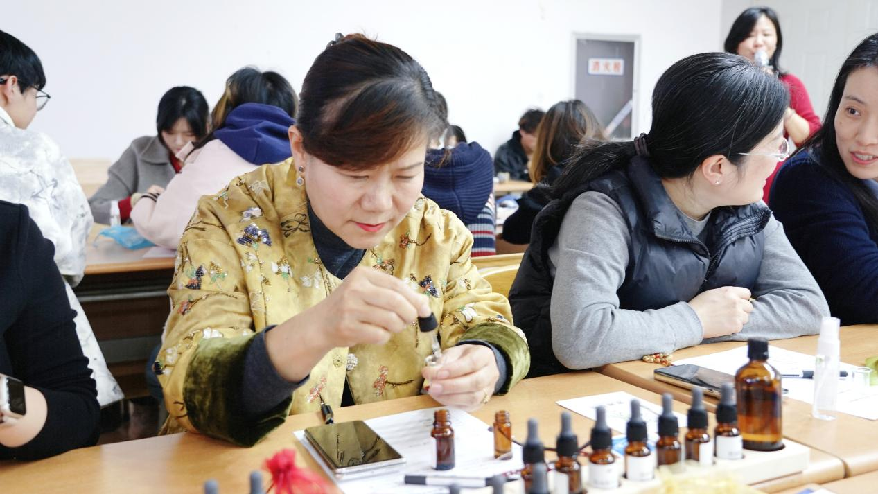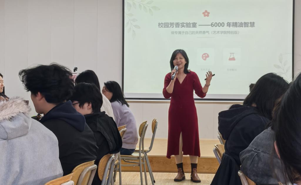 随后,专业芳疗师带来香氛疗愈小课堂,从芳香植物的历史应用、精油的萃取工艺,到不同香调的疗愈功效,再到香气搭配的基础逻辑,用通俗易懂的语言展开细致讲解,重点介绍了薰衣草助眠、柠檬醒神、迷迭香提升专注力等实用芳疗知识,让师生能轻松掌握核心内容。